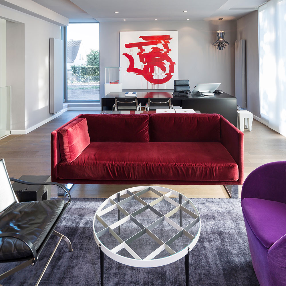 Der seitliche Eingangsbereich hebt sich optisch durch moderne Formgebung vom historischen Gebäude ab und führt die Besucher direkt zum hellen, offenen Empfang. Der aus grünem Naturstein verkleidete Empfangstresen sowie die schwarz getönten, verspiegelten Trennwände zum Bürobereich der Innenarchitekten, getragen von einem massiven Eichendielen-Boden, fangen die Kombination aus historisch und modern punktgenau auf. Links vom Empfang teilt sich das restliche Gebäude in einzelne Bürosektionen für 15 Arbeitsplätze. Rechts daneben liegt im rund 50 m2 großen Anbau das geräumige Chefbüro mit hohem Glasanteil. Die großzügig eingesetzten Fensterflächen unterstreichen den cleanen, zurückhaltenden Charakter des Büros. Farblich wird es von unterschiedlichen Grautöne bestimmt: strukturierte steingraue Textilien wie Vorhänge und Teppich unterstreichen mit einem anthrazitgrauen Scheibtisch den zurückhaltenden Bürocharakter, auch die Decke und der Heizkörper sind darauf abgestimmt. Einen Bruch schafft der Loungebereich, bei dem auf starke Farbkontraste und andersartige Möblierung gesetzt wurde. Ein großflächiges Bild aus der Streetart-Szene nimmt die Farbgebung des Sofas auf und schafft ein spannungsvolles Raumgefühl. Im Obergeschoss gibt es weitere fünf Zimmer mit etwa zehn Arbeitsplätzen. Im Untergeschoss wurde ein Konferenzraum im Neubau realisiert. Der Kontrast aus modernem und geschichtsträchtigem Ambiente bildet ein einzigartiges Raumspiel.