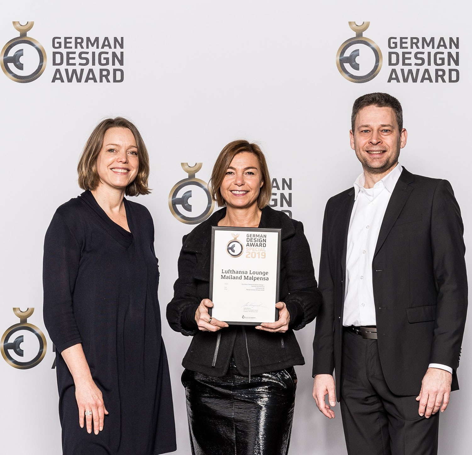 Während das frei stehende Buffet mit den dort servierten Häppchen eine Reminiszenz an den typisch italienischen Aperitivo bildet, schaffen noch weitere Elemente einen Bezug zu Mailand: zum Beispiel der Laufsteg, der vom Eingang zum Buffet führt und mithilfe von Lichtstreifen in Boden sowie Decke inszeniert wurde und an Mailand als Stadt der Mode erinnert. Er weckt aber auch — passend zum Geschehen auf dem Vorfeld — Assoziationen mit einer Landebahn. Das gelungene Interiordesign mit den langlebigen Möbeln und Einbauten aus dem Mineralwerkstoff wurde bereits mit dem renommierten German Design Award 2019 ausgezeichnet und erfreut sich auch bei den Gästen der Lufthansa Lounge großer Beliebtheit.